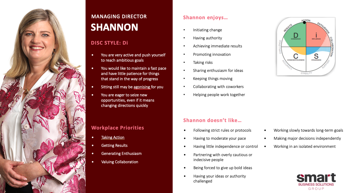 Led by Shannon Smit, an accredited DISC trainer, our team at Smart Business Consulting possesses the expertise to guide you through the DISC profiling journey. From individual assessments to comprehensive team workshops, our DISC Profiling service helps participants gain insight into their own behaviour and a better understanding of others. Our workshops are fun and insightful, and are designed to help everyone in your organisation build more productive and effective relationships at work.